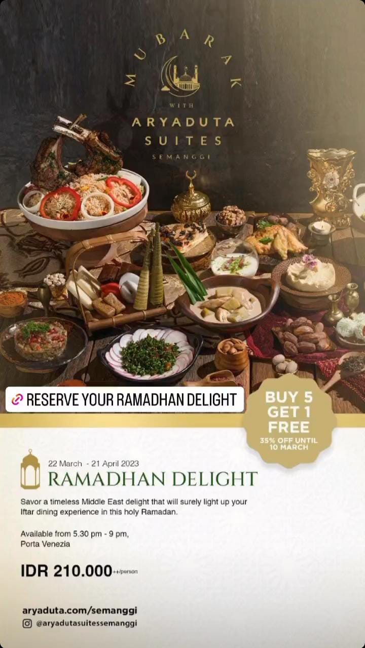 Untuk Iftar Feast, mulai 27 Maret hingga dua hari sebelum Hari Raya Idul Fitri 2023. Lalu, menu buka puasa oleh Iftar Feast akan disajikan secara buffet yang menampilkan berbagai masakan Timur Tengah, Indonesia, dan Internasional. Untuk informasi lebih lanjut silahkan hubungi +62-811-1025-999 dan Instagram @thedharmawangsa.