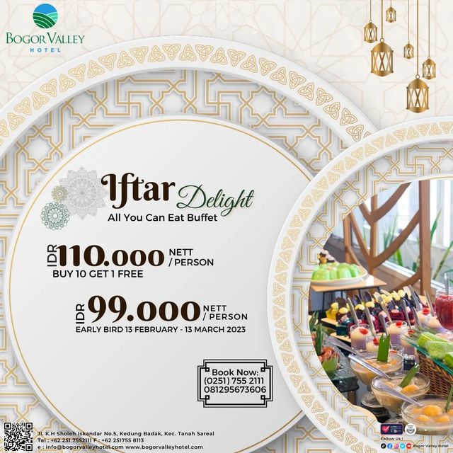 Bogor Valley menghadirkan Iftar Delight All You Can Eat buffet cukup Rp110.000nett/orang dan dapatkan promo beli 10 dapat gratis 1. booking sekarang buruan di 081295673606.