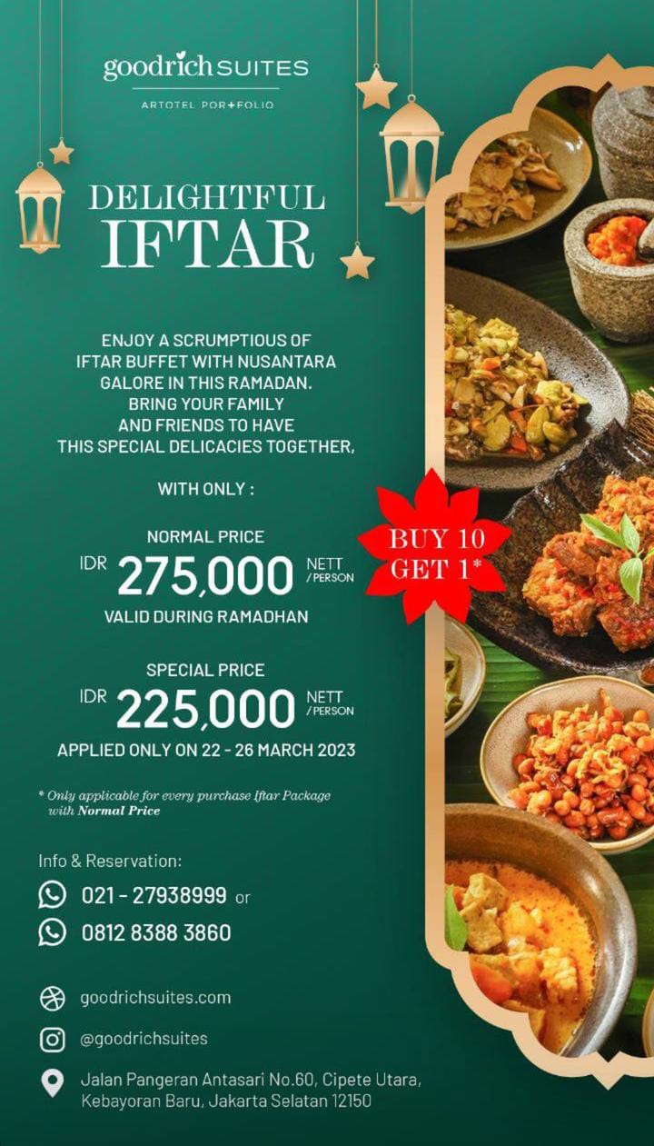 Goodrich menghadirkan Delightful Iftar yang membuat bukber kalian lebih istimewa nih, kalian cukup bayar 10 dapat 11, untuk paket tersebut hanya Rp275.000net/orang. untuk lebih lanjut hubungi 081283883860.