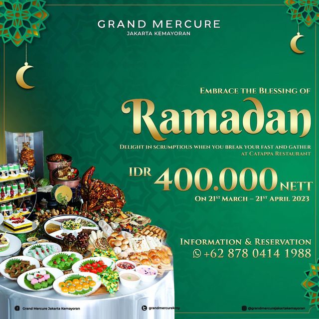 Ramadhan bersama grand mercure memberikan kesan tersendiri nihh, ayoo nikmati promo yang diberikan cuma Rp400.000 kalian sudah bisan nikmati hidangan dari Grand Mercure. informasi dan reservasi bisa hubungi 087804141988.