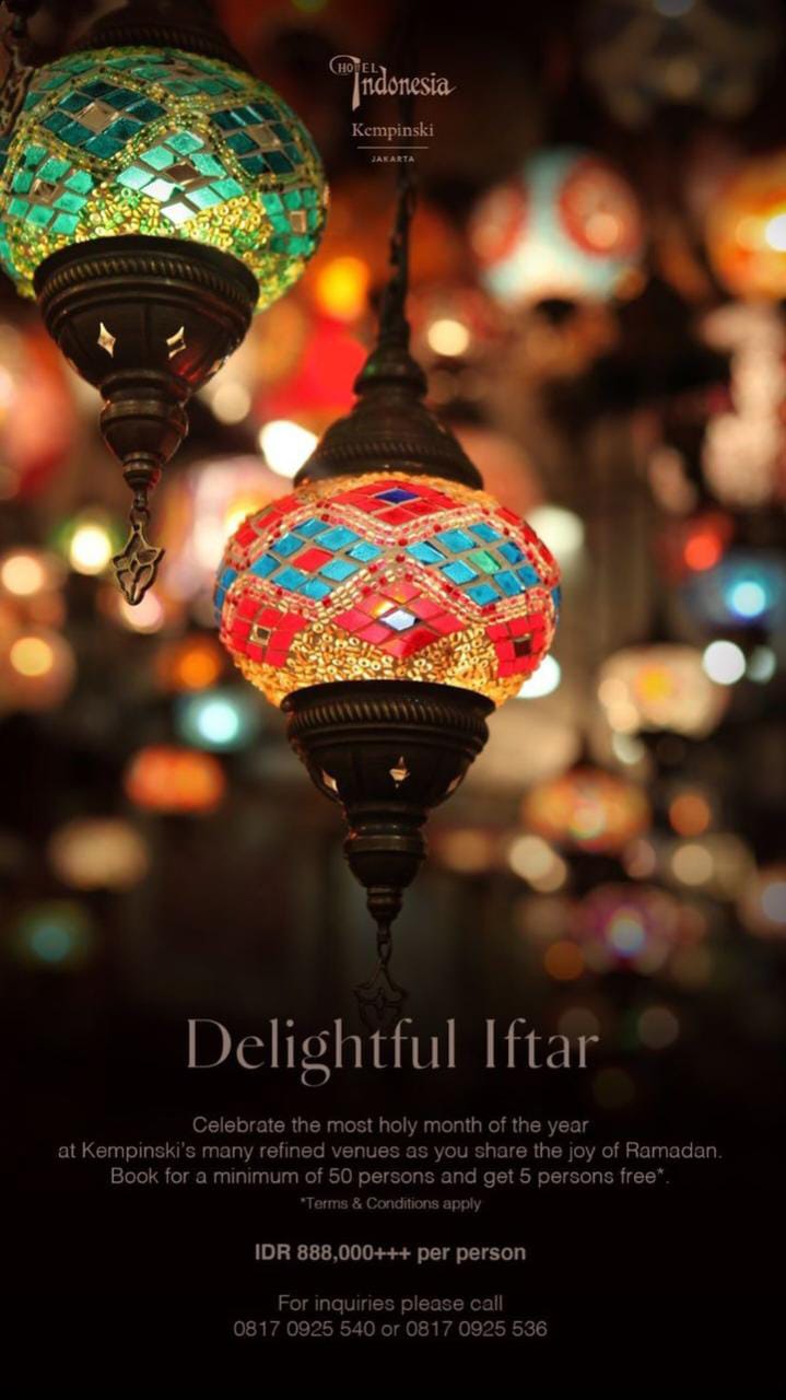 Kempinski Jakarta menghadirkan Delightful Iftar dengan harga Rp888.000/ Orang. kalian bisa mendapatkan promo jika pembelian 50 orang free 5 orang. lebih lanjut hubungi kontak ini 08170925540.