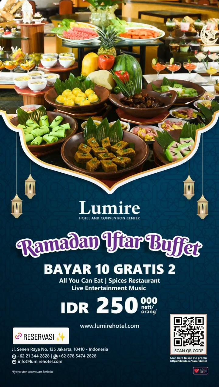 Lumire menghadirkan Ramadhan Iftar buffet All You Can Eat dengan live music untuk menambah suasana bukber kita. Semua bisa dinikmati hanya Rp250.000 nett/orang dan dapatkan promo bayar 10 dapat 12. lebih lanjut bisa hubungi 087854742828.