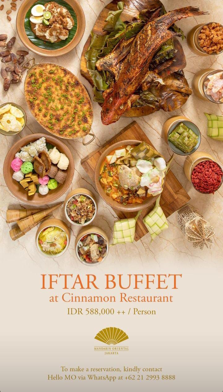 Kini telah hadir Iftar Buffet di Cinnamon Restaurant hotel Mandarin Oriental jakarta harga mulai dari Rp588.000/Orang. untuk lebih lanjut bisa hubungi (021) 2993 8888.