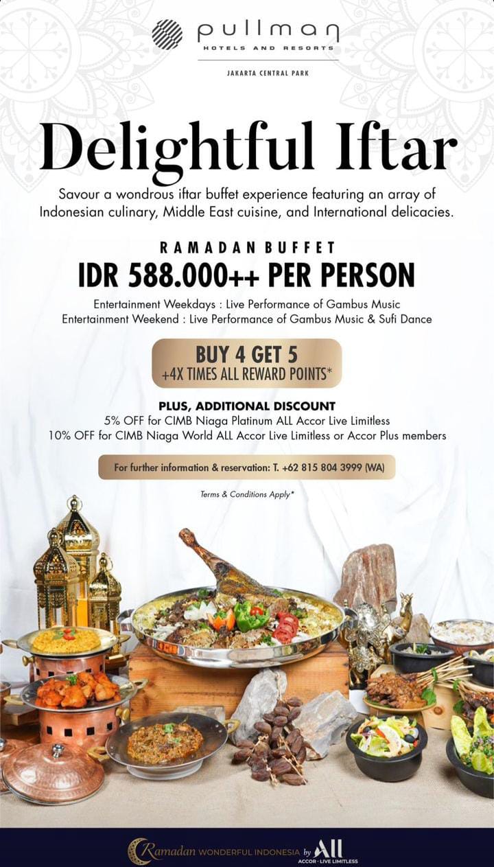 Delightful Iftar bersama pullman hotel kalian akan disuguhkan tiap harinya musik gambus dan jika kalian berkunjung saat weekend akan ditambahkan tarian sufi. cukup Rp588.000/orang. Untuk reservasi hubungi 08158043999.