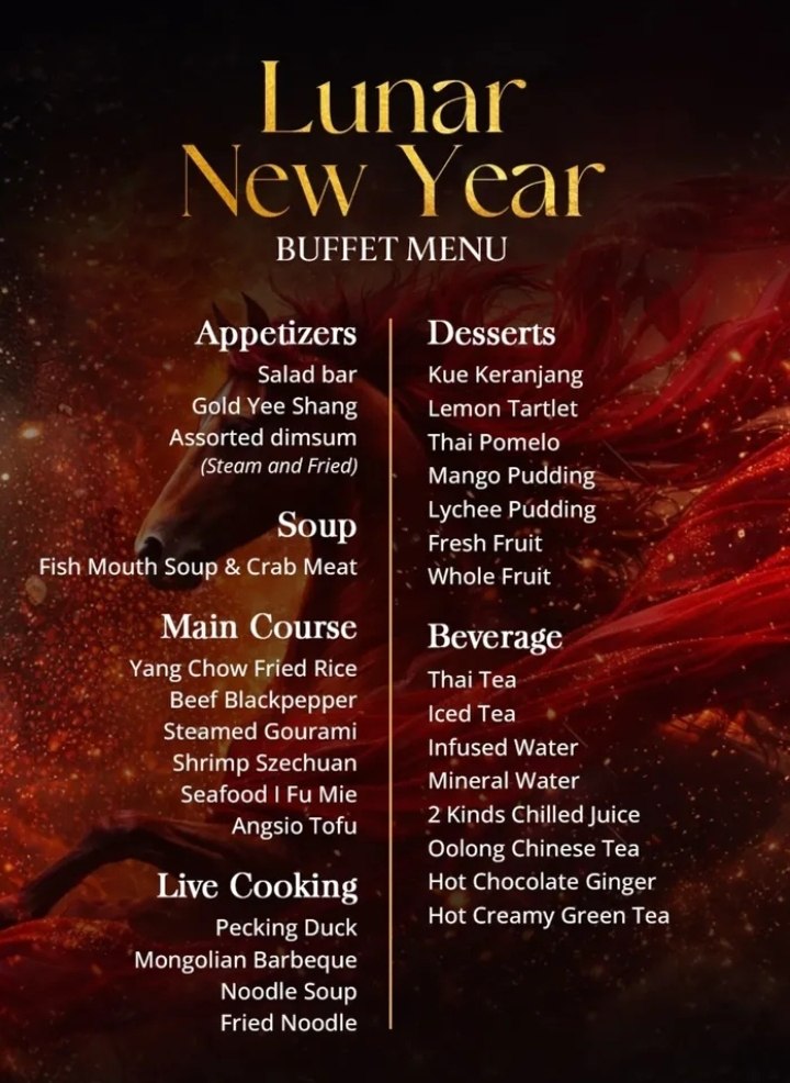Disajikan secara all you can eat, Lunar New Year Dinner Buffet menghadirkan pilihan menu lengkap dari appetizer hingga dessert, termasuk live cooking yang menggugah selera.