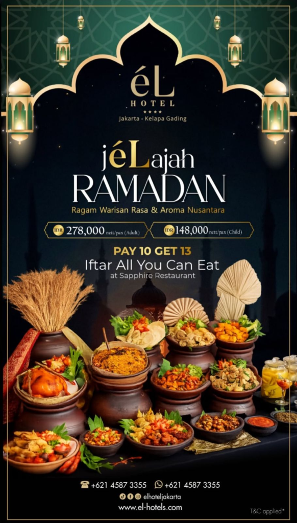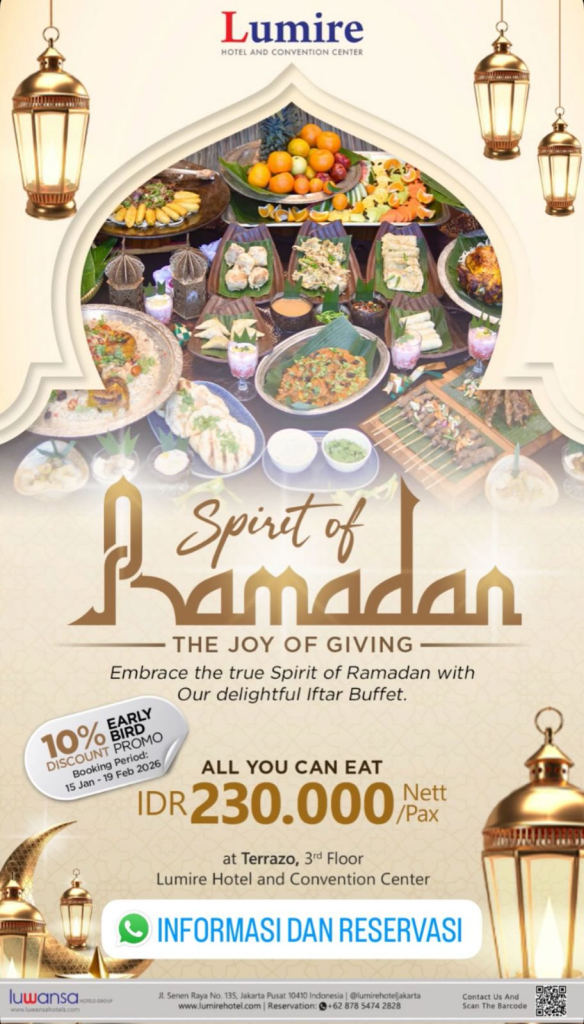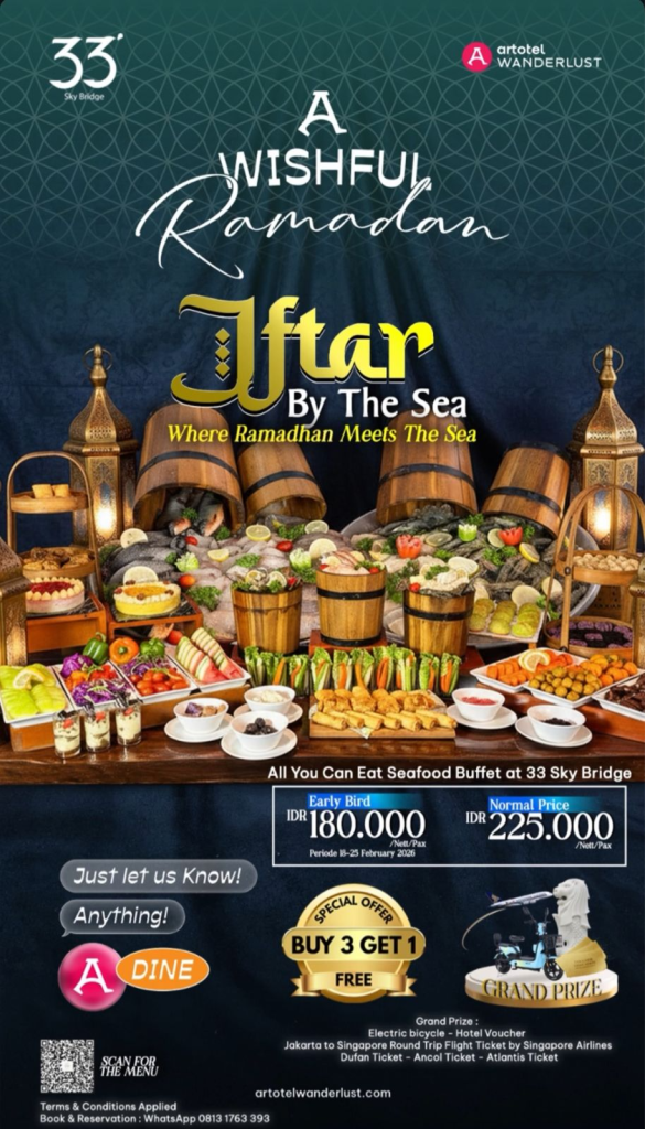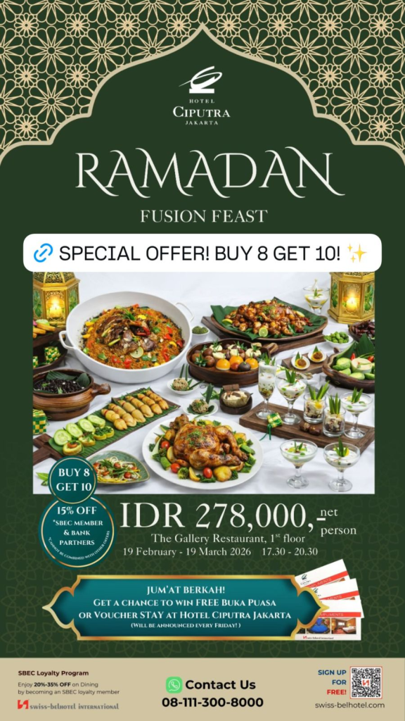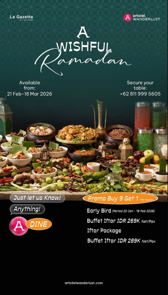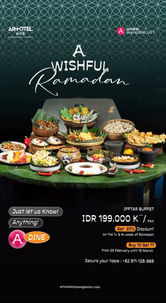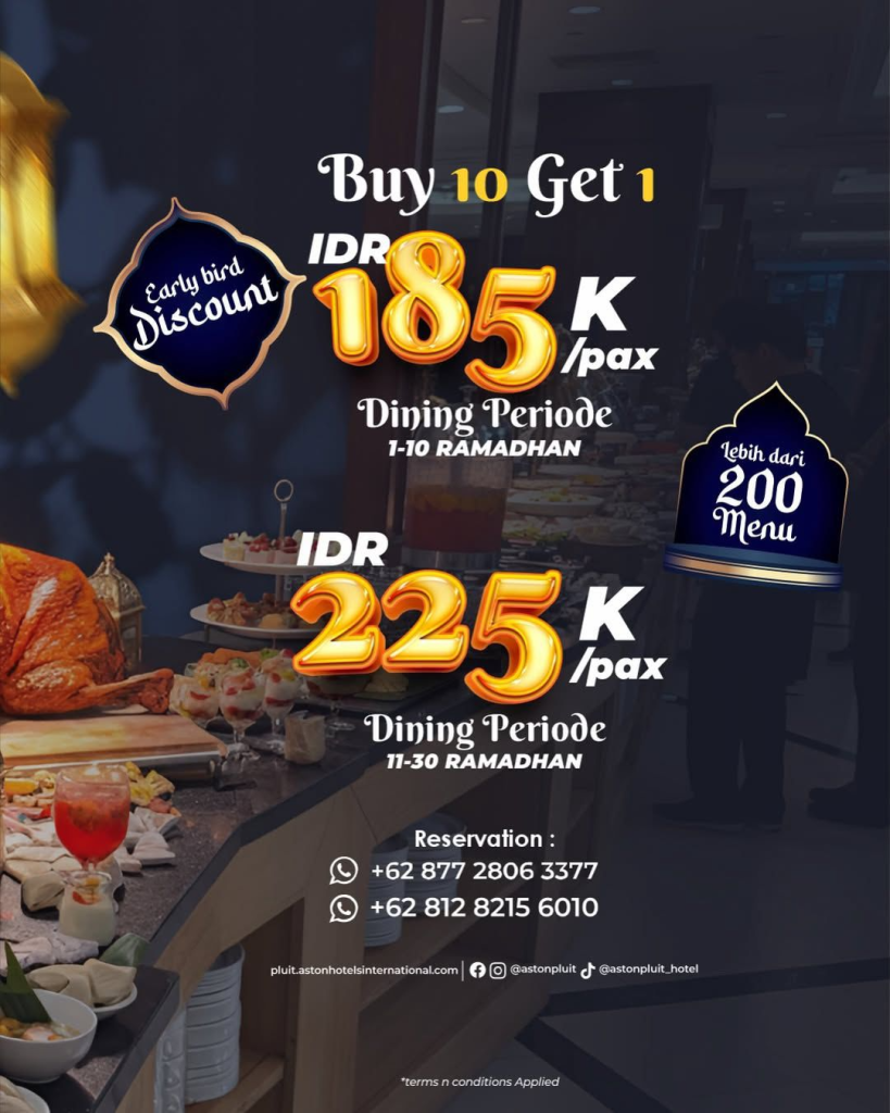 Sambut bulan Ramadan dengan paket “A Wishful Ramadan” seharga IDR 199.000 nett/pax. Nikmati penawaran Get 20% Discount yang berlaku pada minggu ke-1 dan ke-4 bulan Ramadan. Selain itu, tersedia promo “Buy 10 Get 11” untuk periode pemesanan dari 25 Februari hingga 15 Maret 2026. Segera amankan meja Anda untuk pengalaman berbuka yang berkesan. Reservasi: +62 811-128-868.