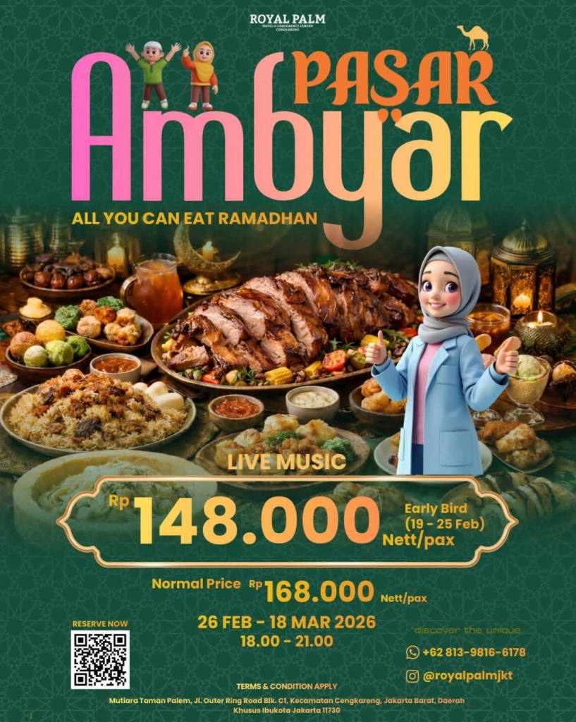 menghadirkan paket Iftar “Pasar Ambyar” seharga Rp 148.000 Nett (Early Bird 19–25 Feb) dan Rp 168.000 Nett (Normal 26 Feb – 18 Mar), sudah termasuk hiburan Live Music setiap hari. Nomor reservasi: 0813-9816-6178