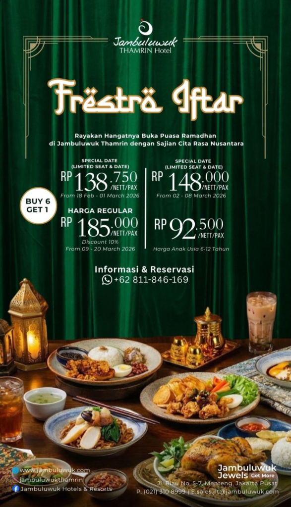 Jambuluwuk Thamrin Hotel menyajikan paket berbuka “Frësträ Iftar” dengan harga spesial Rp 138.750 nett/pax (18 Feb – 1 Maret 2026), Rp 148.000 nett/pax (2 – 8 Maret 2026), dan harga reguler Rp 185.000 nett/pax (9 – 20 Maret 2026). Tersedia promo “Buy 6 Get 1”, harga khusus anak (usia 6-12 tahun) sebesar Rp 92.500 nett/pax, serta reservasi dapat dilakukan melalui nomor 0811-846-169.