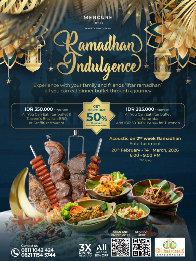Mercure Jakarta Simatupang menawarkan paket berbuka “Ramadhan Indulgence” All You Can Eat sehargaIDR 350.000 ++/person di Graffiti Restaurant (termasuk Tucano’s Brazilian BBQ) dan IDR 285.000 ++/person di Karumba, dengan promo diskon spesial 50% bagi pemegang struk belanja dari Diamond Supermarket. Paket yang berlangsung dari 20 Februari – 14 Maret 2026 ini juga menyuguhkan hiburan Acoustic Live pada minggu kedua Ramadhan. Reservasi dapat dilakukan melalui nomor 0811 1042 424 atau 0821 1154 5744