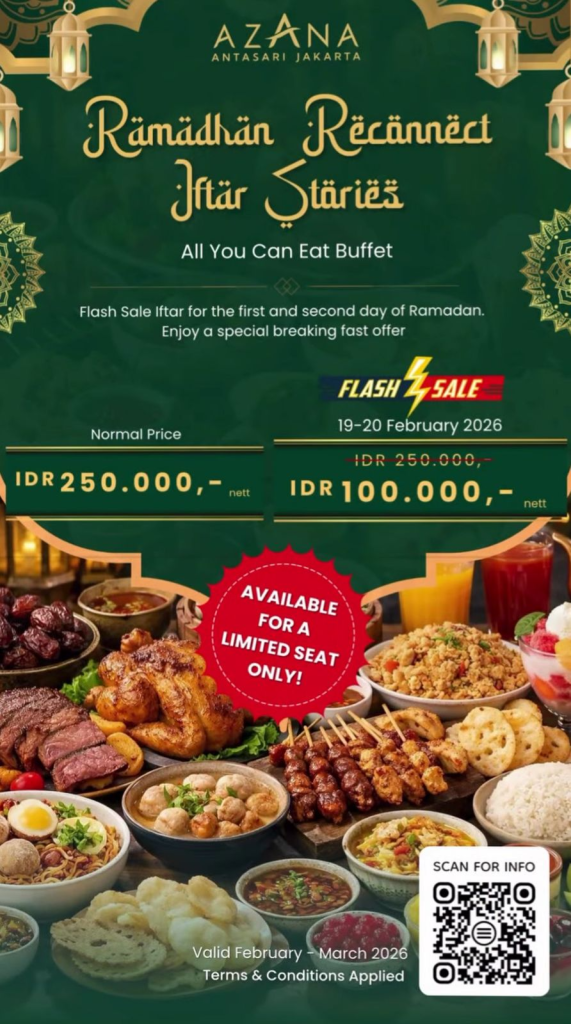 Azana Suite Hotel Antasari menyelenggarakan buffet All You Can Eat bertajuk “Ramadhan Reconnect Iftar Stories” dengan harga normal IDR 250.000 nett, namun tersedia penawaran Flash Sale seharga IDR 100.000 nett khusus untuk periode 19–20 Februari 2026. Paket ini tersedia untuk kuota terbatas (limited seat) selama bulan Februari hingga Maret 2026.