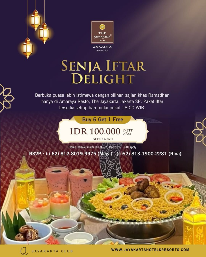 The Jayakarta SP Jakarta Hotel & Spa menawarkan paket berbuka “Senja Iftar Delight” di Amaraya Resto seharga IDR 100.000 Nett/Pax untuk pilihan set up menu. Paket yang tersedia setiap hari mulai pukul 18.00 WIB ini memiliki promo spesial “Buy 6 Get 1 Free” yang berlaku dari tanggal 18 Februari – 20 Maret 2026. Nomor reservasi: 0812-8019-9975 atau 0813-1900-2281