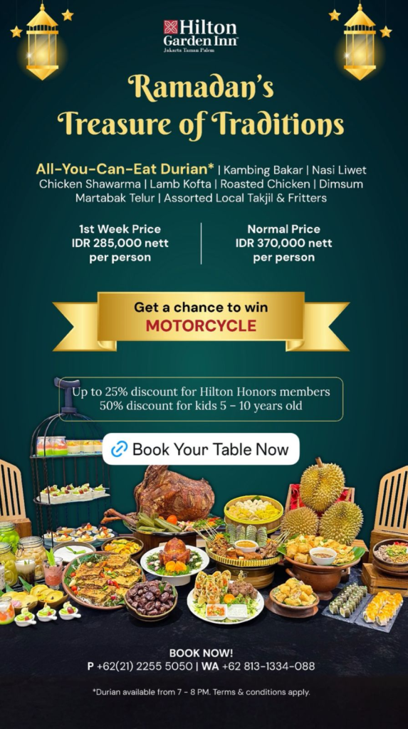 Harga spesial paket iftar minggu pertama IDR 285.000 net/pax (Normal IDR 370.000 net/pax), termasuk promo All You Can Eat Durian setiap jam 19.00-20.00 WIB. Tersedia diskon 25% bagi member Hilton Honors, diskon 50% untuk anak-anak, serta kesempatan memenangkan Grand Prize 1 unit sepeda motor. RSVP +62 813-1334-088 atau +62 (21) 2255 5050