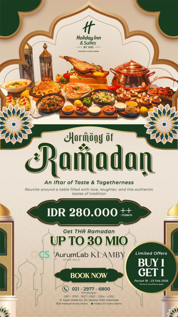 Harmony of Ramadan Iftar Buffet IDR 280.000++ /person. Promo Buy 1 Get 1 (18-23 Feb 2026), THR Ramadan up to 30 Mio. Harmony of Ramadan Stay IDR 1.388.000 nett/night (incl. Iftar & Sahur) | RSVP: 021-2977-6800 / WA 0811-9761-1827