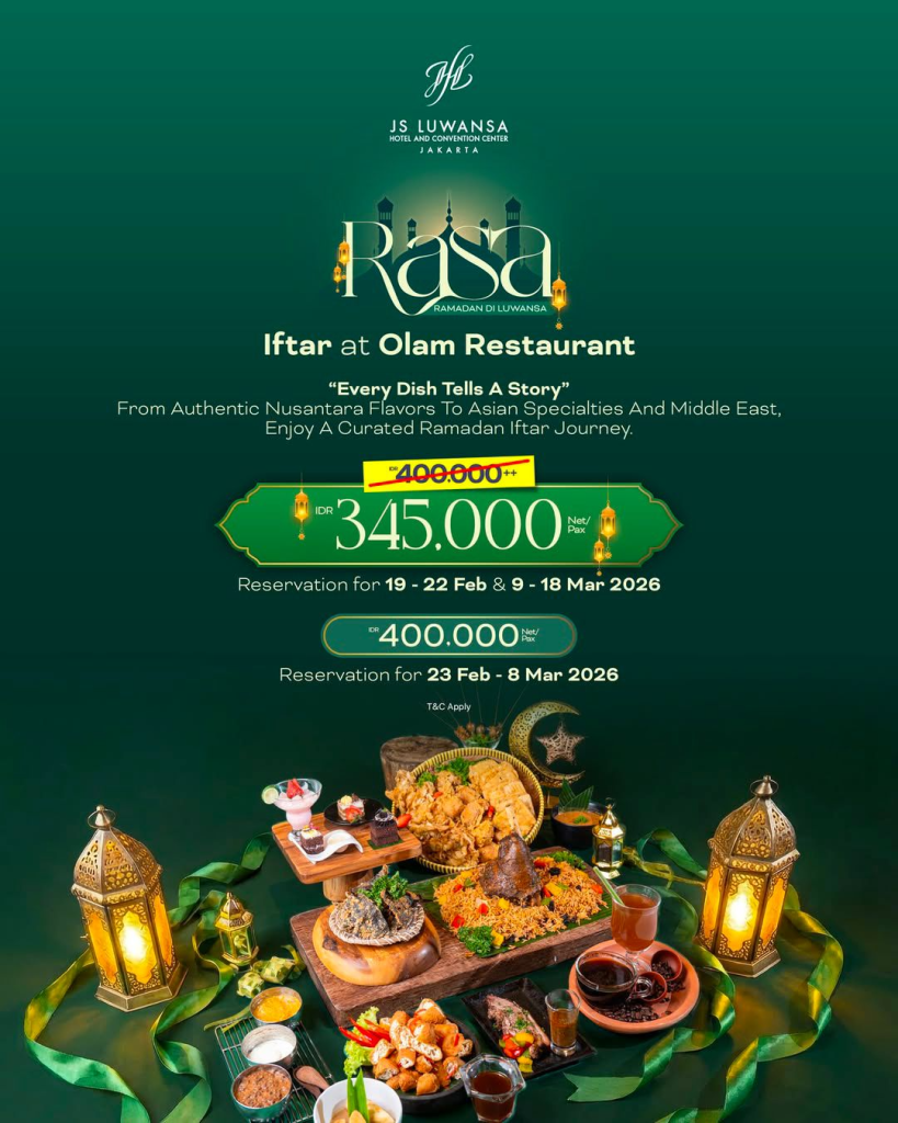 Nikmati paket berbuka “RASA Iftar” di Olam Restaurant seharga IDR 345.000 nett/pax (periode 19–22 Feb & 9–18 Mar) atau IDR 400.000 nett/pax (23 Feb – 8 Mar). Tersedia juga paket menginap mulai dari IDR 1.080.000 nett/malam serta paket meeting Ramadan mulai dari IDR 568.000 nett/pax. Rasakan pengalaman berbuka yang berkesan dengan pelayanan bintang 4. Reservasi: 021-2954 3030 / WA 0811 1106 852.
