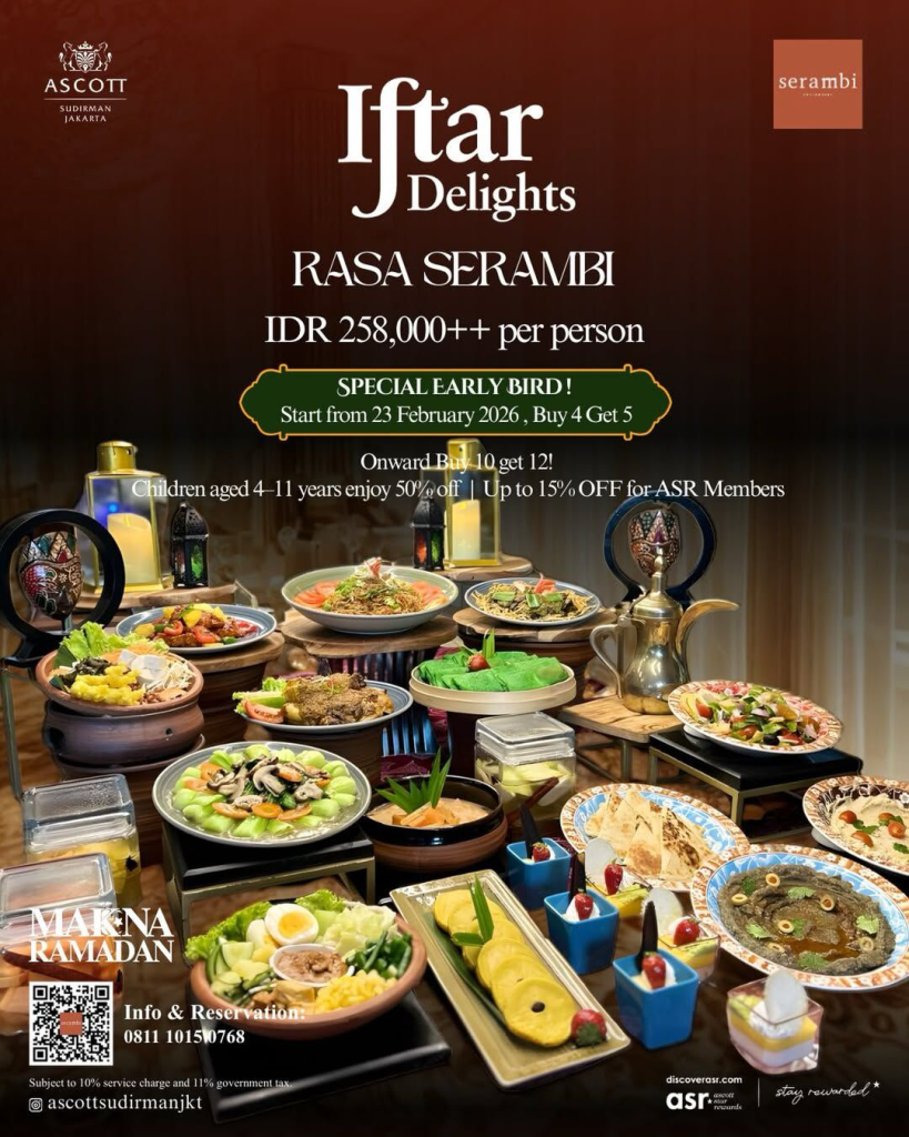 Menghadirkan pengalaman berbuka puasa bertema “Rasa Serambi” dengan harga IDR 258.000++ per orang. Manfaatkan promo Special Early Bird: Buy 4 Get 5 yang dimulai dari tanggal 23 Februari 2026. Selain itu, tersedia penawaran Buy 10 Get 12, diskon 50% untuk anak usia 4–11 tahun, serta diskon hingga 15% khusus bagi anggota ASR (Ascott Star Rewards). Info & Reservasi: 0811 1015 0768