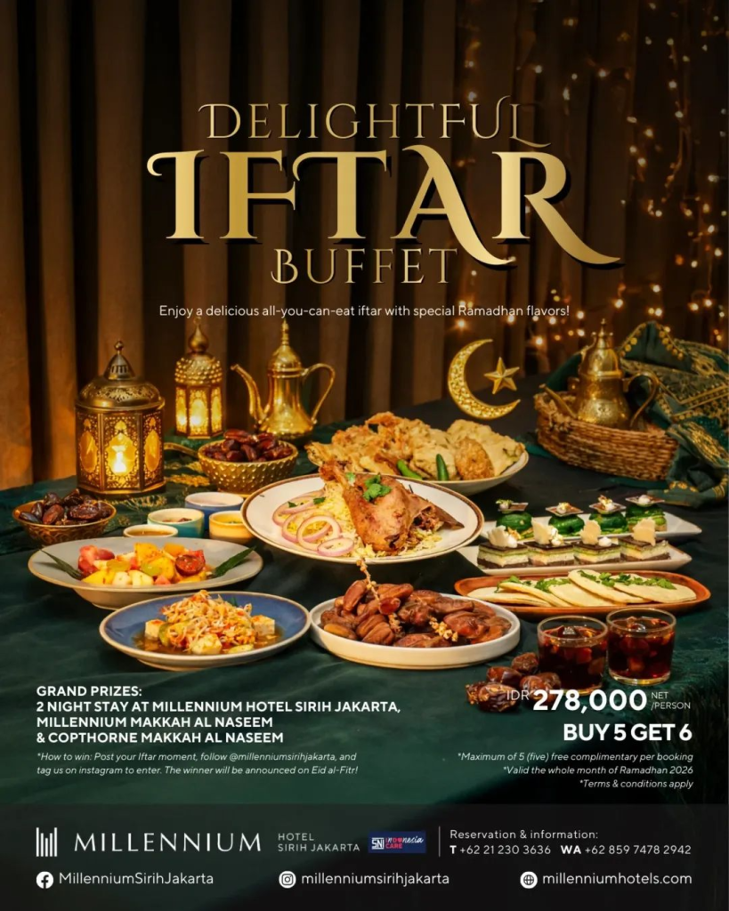 Hadir dengan paket “Delightful Iftar Buffet” seharga IDR 278.000 net/person. Nikmati penawaran spesial “Buy 5 Get 6” yang berlaku selama bulan Ramadan 2026. Tamu juga berkesempatan memenangkan Grand Prizes berupa menginap 2 malam di Millennium Hotel Sirih Jakarta, Millennium Makkah Al Naseem, atau Copthorne Makkah Al Naseem. Reservasi: 021 230 3636 / WA 0859 7478 2942