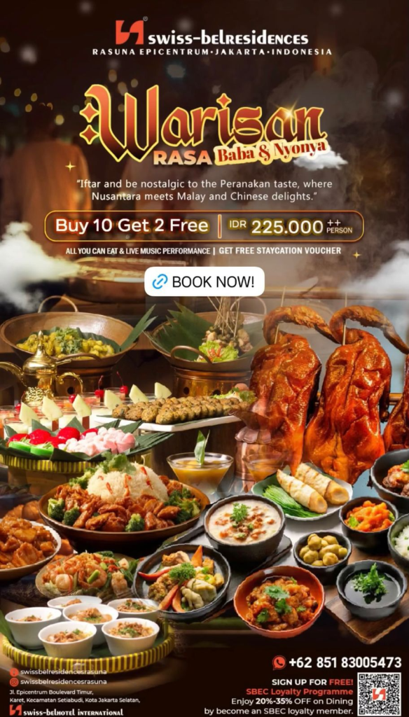 Swiss-Belresidences Rasuna Epicentrum menghadirkan paket All You Can Eat bertajuk “Warisan Rasa Baba & Nyonya” seharga IDR 225.000 ++/person yang sudah termasuk suguhan Live Music Performance serta kesempatan mendapatkan voucher staycation gratis. Penawaran ini dilengkapi dengan promo spesial “Buy 10 Get 2 Free”. Nomer reservasi: +62 851 83005473.