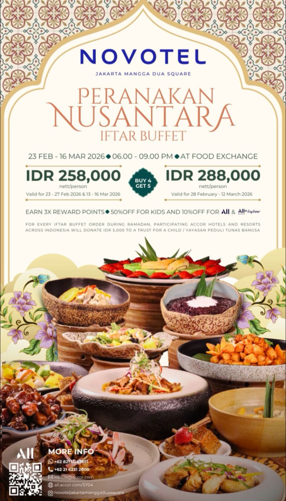 Novotel Jakarta Mangga Dua Square menyajikan Iftar Buffet bertajuk “Peranakan Nusantara” seharga IDR 258.000 nett (untuk periode 23–27 Feb & 13–16 Mar 2026) dan IDR 288.000 nett (untuk periode 28 Feb – 12 Mar 2026) dengan promo “Buy 4 Get 5”, serta tersedia paket privat mulai dari IDR 300.000 nett termasuk pemakaian ruang meeting selama 4 jam. Nomor reservasi: 0821 1114 1651 atau 0858 6381 1773.