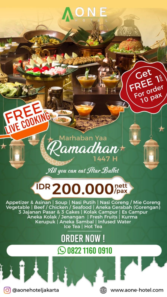 Aone Hotel Jakarta menawarkan paket All You Can Eat Iftar Buffet bertajuk “Marhaban Yaa Ramadhan 1447 H” seharga IDR 200.000 nett/pax yang dilengkapi dengan fasilitas Free Live Cooking serta promo “Get Free 1 Pax” untuk setiap pemesanan 10 pax. Selain itu, tersedia juga paket “Rooftop Private Bukber” seharga IDR 300.000/pax dengan minimal pemesanan 30 pax. Reservasi dapat dilakukan melalui nomor 0822 1160 0910.